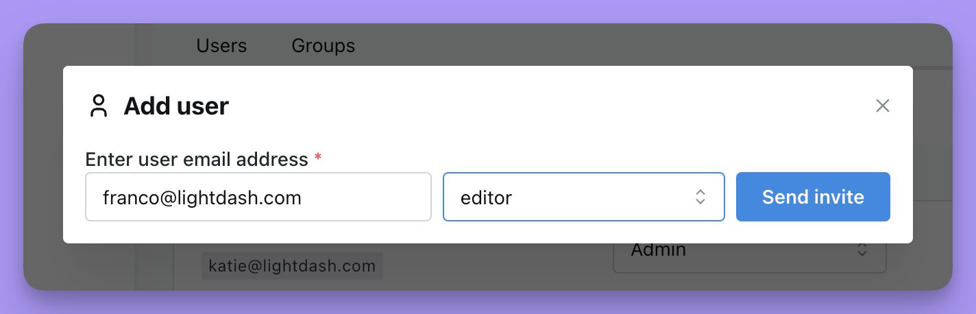 You then need to input the email address of the user you want to invite and select the role you want to assign them. Read more about user roles and permissions in Lightdash here. Once you hit Send invite, we’ll send an email to the new user with their invite link.