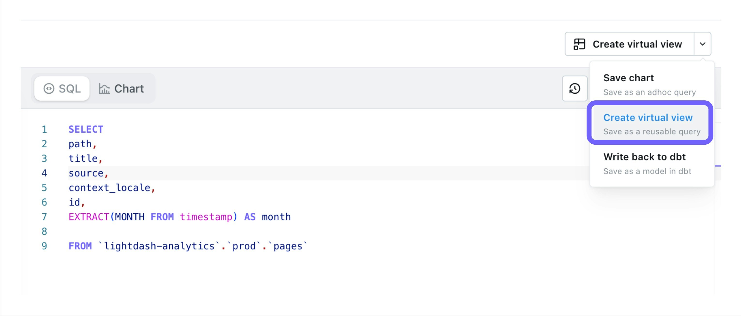 To create a Virtual View from the SQL Runner, select theCreate Virtual View option from the save drop-down.