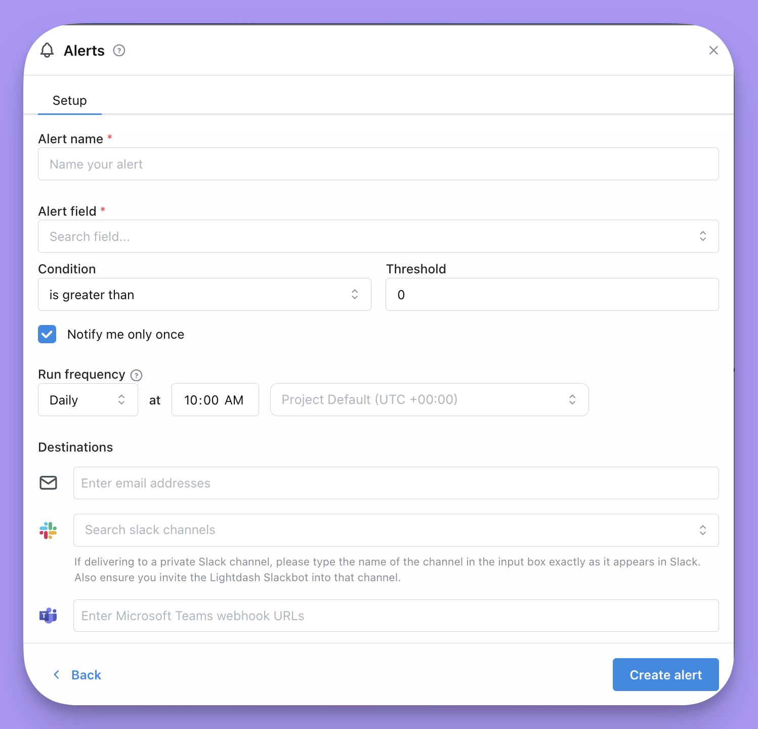 - Send to: here, you can pick if you want to send your alert to Slack, email, or both. You can add as many Slack channels and email addresses as you’d like to here. You can send an alert to a person in Slack using