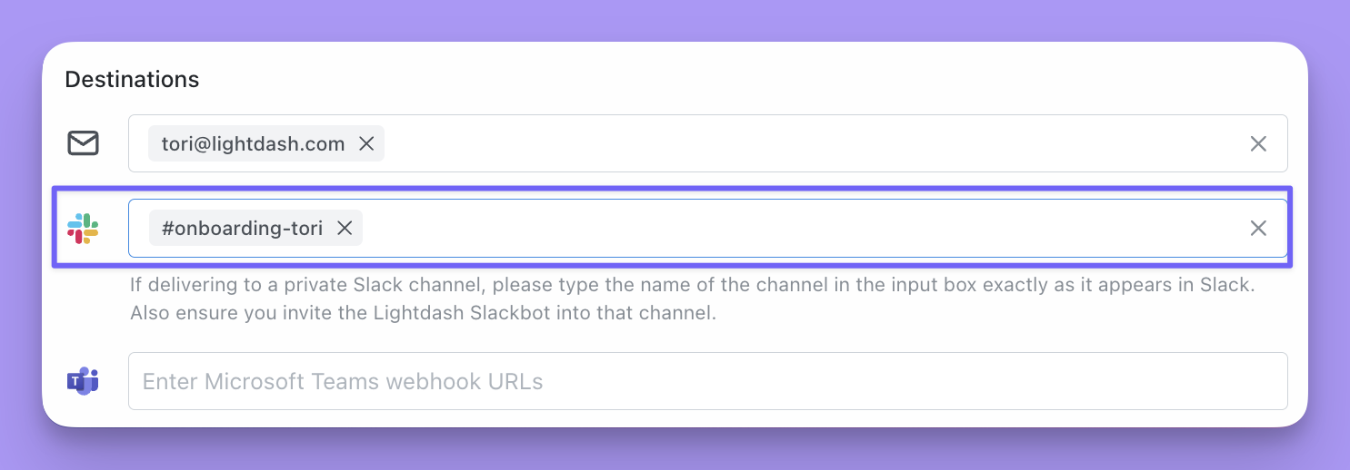 You can also send alerts to private Slack channels. To do this, simply type the name of the Slack channel exactly as it appears in Slack into the input text box. Then click on it to confirm and save the alert.You must add the Lightdash slack bot into the private Slack channel for it to be able to post alert results.